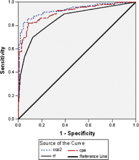 Fernandez-Suarez A, Reneses S, Wichmann I, Criado R, Nunez A (2005) Efficacy of three ELISA measurements of anti-cyclic citrullinated peptide antibodies in the early diagnosis of rheumatoid arthritis. Clin Chem Lab Med 43(11):1234–1239. doi:10.1515/CCLM.2005.214
