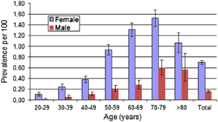 Sound epidemiological data are a basic requirement for decision making on the allocation of health care resources. Unfortunately, this is not the case in Estonia, where the paucity of epidemiological data has impeded health care planning for rheumatic conditions. The current paper presents the first effort to explore the epidemiology of rheumatoid arthritis (RA) in Estonia. Electronic databases of all rheumatology units of Harju County, three national and one private, were searched for the records of RA (ICD-10 diagnoses M05 and M06.0) patients who had visited a rheumatologist during 2006 or 2007. Prevalence of RA was calculated for the age 20 years and older and for subsets according to age and gender, using the numbers from the patients’ database in the numerator and the corresponding population numbers in the denominator. The total number of prevalent RA cases was 1,897, of which 85 % (n = 1,605) were women. The overall crude period prevalence 2006–2007 of RA in Harju County for the age group 20 years and older was 0.46 %. RA prevalence for both sexes increased with age until the age of 70–79 years and decreased subsequently. Prevalence of RA was significantly higher for women compared with men in all age groups. The prevalence of RA among women and men 20 years and older was 0.70 % (6.68–7.37) and 0.16 % (1.42, 1.79), respectively. Age-standardized (European population) prevalence rate was 0.44 %. The results are concordant with epidemiological data on RA prevalence derived recently in other European countries.