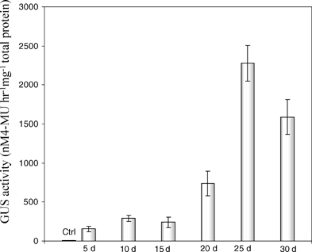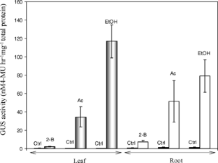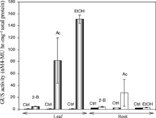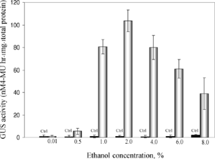 We tested the efficiency and optimized the conditions for controlled alcohol-inducible transgene expression in Populus using gus as a reporter gene. Specificity of induction, efficiency in different organs, effect of three chemical inducers, and induction methods were tested using up to 10 independent transgenic events generated in two different Populus genotypes. The optimal inducer concentration and the duration of induction period were determined in dose–response and in time–course experiments. Under in vitro conditions, β-glucuronidase (GUS) induction was efficient both in the aerial parts and in the roots of regenerated plantlets. Among the chemical inducers tested, ethanol was the most effective activator with no apparent phytotoxicity when concentrations were at or below 2%. After 5 days of treatment, fluorometrically-determined the GUS activity could be detected when inducing with ethanol at concentrations as low as 0.5%. Prolonged induction by ethanol vapors significantly increased the GUS activity in leaves from both the tissue culture plants and greenhouse-grown plants.