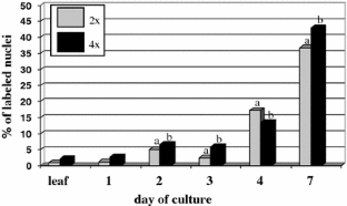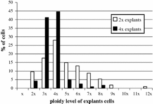 Leaf explants of diploid (2n = 2x = 10) and autotetraploid (2n = 4x = 20) plants of Arabidopsis thaliana ecotype Columbia were cytologically and cytogenetically analysed to determine the time and the mechanisms of the process of polyploidization. The first polyploid cells were observed after the third day of culture in both genotypes of explants. Polyploid cells were the result of pre-existing mixoploidy in explants of A. thaliana. Other factors such as endoreduplication, endomitosis, abnormal microtubules arrangement and DNA damage may have induced polyploidization during early stages of callogenesis.