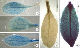 The authors acknowledge Conselho Nacional de Desenvolvimento Científico e Tecnológico (CNPq) for the M.Sc. student fellowship to the first author. The second, fourth, fifth and sixth authors acknowledge CNPq for research fellowships. The authors thank Fundo de Defesa da Citricultura (Fundecitrus) and CNPq for financial support (Proc. 474184/2008-0). The authors thank Centro APTA Citros Sylvio Moreira for kindly providing part of the germplasm material for the experiment. The authors thank Dr. Marcio Gilberto Cardoso Costa for providing the gene construct utilized as the positive control in the histochemical GUS assay. The authors also acknowledge Ms. Flavia Zambon and Meire Menezes Bassan for technical support, and Dr. Jay Lee Schell for critical comments.