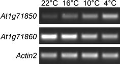 The bidirectional promoter of the Arabidopsis thaliana gene pair At1g71850/At1g71860 harbors low-temperature-responsive elements, which participate in anti-correlated transcription regulation of the driving genes in response to environmental low temperature.