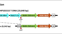 Genomic DNA was isolated from leaf tissue using the method of Chen and Dellaporta (1994) with minor modifications. To confirm the presence of the GFP transgene (ZsGreen) and the absence of the CRE transgene in the T0 population, PCR assays were performed using the KAPA 3G Plant PCR kit (KAPA Biosystems) following the manufacturer’s instructions for PCR using purified DNA. The GFP amplicon is 598 bp and the primers were 5′-CCTGACCAAGGAGATGACCA-3′ (forward)/5′-GTCAGCTTGTGCTGGATGAA-3′ (reverse). The PCR assay for the presence/absence of the CRE transgene utilized the primers 5′-CAGTGAAGACCATCCAGCAA-3′ (forward)/5′-CCTAATGTCCTGGCACCTGT-3′ (reverse) resulting in a 227-bp amplified fragment. PCR conditions were 95 °C 3 min followed by 35 cycles of 95 °C 20 s/58 °C 15 s/72 °C 30 s, followed by a final extension at 72 °C 1 min. Products were visualized on a 1.2% agarose gel. In T1 lines, the presence/absence of the GFP (ZsGreen) and CRE transgenes was tested using the above primers in conjunction with KAPA 3G Plant PCR kit (KAPA Biosystems) following the manufacturer’s instructions for direct PCR from leaves. In that case, the PCR conditions were 95 °C 10 min followed by 35 cycles of 95 °C 30 s/57 °C 15 s/72 °C 30 s, followed by a final extension at 72 °C 1 min. Products were visualized on a 1.2% agarose gel. For Southern analysis, 15 µg of gDNA was cut overnight at 37 °C using either EcoRV or BamHI (New England Biolabs, Ipswitch, MA, USA), both of which cut only once inside the loxP to Agrobacterium LB interval found on the transformation plasmid PHP78891 (see Fig. 1). Southern transfer was performed following standard high-salt procedures; GFP and CRE probes were synthesized using the primers discussed above in conjunction with the PCR DIG Probe Synthesis Kit (Roche Applied Science, Indianapolis, IN, USA) according to the manufacturer’s instructions. The pre-hybridization, hybridization, post-hybridization washes, and chemiluminescent detection procedures were all performed according to the manufacturer’s instructions (Roche Applied Science, Indianapolis, IN, USA).