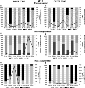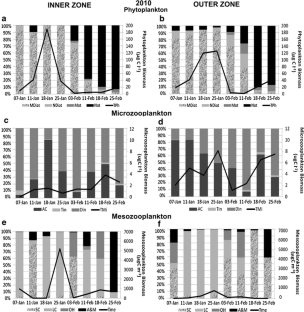 Rapid climate-driven melting of coastal glaciers may control plankton dynamics in the Western Antarctic Peninsula. It is known that in Potter Cove, 25 de Mayo/King George Island, phytoplankton is tightly coupled to meltwater input. However, no information on zooplankton is available in this regard. The aim of this study was therefore to examine the structure and dynamics of microzooplankton and mesozooplankton in two zones (the inner and outer Potter Cove) differently impacted by glacier melting during two contrasting austral summers (2010 and 2011). Microzooplankton composition differed between the two zones and years analyzed, and its total biomass was observed to be highest far from the glacier influence and during 2010. Mesozooplankton composition and biomass were similar in the two zones and years analyzed. Colder than usual conditions in the summer of 2010 prevented glacier melting, thus favoring the development of an exceptional micro-sized diatom bloom (~190 µg C l−1 and >15 µg l−1 chlorophyll a), which was tightly followed by a maximum in large copepod abundance. After the bloom and in coincidence with intense glacier melting, large diatoms and large copepods were observed to be replaced by nanophytoplankton and microzooplankton (aloricate ciliates and dinoflagellates), respectively. In 2011, low phytoplankton abundance, probably controlled by high tintinnid biomass, was observed as a result of warmer temperatures than 2010 and low-salinity waters. Large copepods appeared to have exerted a high grazing pressure on aloricate ciliates and heterotrophic dinoflagellates in 2011. Our results suggest that whereas the joint effect of water temperature, salinity and phytoplankton availability as well as composition could be of primary relevance in structuring micro- and mesozooplankton community, zooplankton could be of secondary relevance in controlling phytoplankton biomass in Potter Cove during the two summers analyzed.