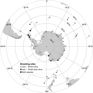 In this study, we investigate the numbers, productivity and territory distribution of the two species of skuas (brown Stercorarius lonnbergi and south polar Stercorarius maccormicki) breeding at Signy Island, South Orkneys, and compare the results with trends elsewhere. Comparison with previous counts indicates a biphasic increase in brown skuas at Signy Island; much faster from 1958/1959 to 1982/1983 (3.3 % per annum), than in subsequent years (0.4 % per annum from 1983/1984 to 2013/2014). Relative distribution of territories has changed little over time. The reduced rate of population growth in recent years was broadly coincident with a decrease in numbers of penguins (and therefore potential prey), which may also explain recent reductions in skua numbers at other Antarctic sites. As prey have become limiting, breeding success of brown skuas at Signy Island is now slightly lower than in the 1950s/early 1960s, but timing of breeding does not appear to have changed. Brown skuas at Signy Island may still have enough resources to start breeding, but as the season progresses and availability of resources declines, chick survival is reduced. South polar skuas have declined from ten pairs in 1982/1983 to one pair in 2013/2014, and mixed pairs have increased from one to three pairs. A review of the literature indicated that although population trend data are available for relatively few sites elsewhere in the subantarctic and Antarctic, numbers of brown skuas appear to be generally decreasing or stable, and of south polar skuas to be stable or increasing.
