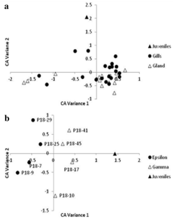 Online Resource 1 Taxonomic classification of 16S rRNA gene sequences from gill and oesophageal gland-associated bacterial clone libraries as determined by RDP Classifier (Wang et al. 2007). Classifications with a confidence estimate of above 80% were used