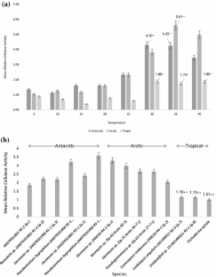 Soil microbes play important roles in global carbon and nutrient cycling. Soil microfungi are generally amongst the most important contributors. They produce various extracellular hydrolase enzymes that break down the complex organic molecules in the soil into simpler form. In this study, we investigated patterns of amylase and cellulase (which are responsible for breaking down starch and cellulose, respectively) relative activity (RA) on solid media at different culture temperatures in fungal strains from Arctic, Antarctic and tropical soils. Fungal isolates from all three regions were inoculated onto R2A media supplemented with starch for amylase and carboxymethylcellulose and trypan blue for cellulase screening. The isolates were then incubated at 4, 10, 15, 20, 25, 30, 35 and 40 °C and examined for activity after 5 and 10 days, for tropical and polar isolates, respectively. The data obtained indicate that the polar fungal strains exhibited similar patterns of amylase and cellulase RA. Both Arctic and Antarctic fungi showed highest RA for amylase and cellulase at 35 °C, while colony growth was maximised at 15 °C. Colony growth and RA of the polar isolates were negatively correlated suggesting that, as temperatures increase, the cells become stressed and have fewer resources available to invest in growth. Unlike polar isolates, tropical isolates did not exhibit any trend of colony growth with temperature, rather having idiosyncratic patterns in each isolate. The low enzyme production and RA levels in the tropical strains may suggest both a low ability to respond to temperature variation in their natural thermally stable tropical habitats, as well as a level of thermal stress limiting their enzyme production ability.