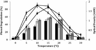 Phenol is an important pollutant widely discharged as a component of hydrocarbon fuels, but its degradation in cold regions is a great challenge due to the harsh environmental conditions. To date, there is little information available concerning the biodegradation of phenol by indigenous Antarctic bacteria. This study addresses the isolation of three phenol-degrading bacterial strains from King George Island, Antarctica. Based on preliminary screening, three isolates (AQ5-05, AQ5-06 and AQ5-07) capable of completely degrading 0.5 g/L phenol within 120 h at 10 °C were selected for detailed study. Two were identified as Arthrobacter spp., and one Rhodococcus sp., based on 16S rRNA sequences. All strains were non-motile, Gram positive, oxidase negative and catalase positive. A study on the effects of parameters including temperature, pH, salinity and nitrogen source was conducted to optimise the conditions for phenol degradation. This revealed that the three isolates were psychrotolerant with the optimum temperature for phenol degradation between 10 and 15 °C. This study suggests the potential use of cold-adapted bacteria in the bioremediation of phenol over a wide range of low temperatures.