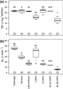 The snailfish, Careproctus pallidus, is a liparid fish that spawns within the branchial chambers of the king crab Lithodes santolla and develops its embryonic stages inside the chambers until it forms a well-developed free-living yolk-sac feeding larvae hatch. The aim of this work was to explore the decrease in energy content of C. pallidus during its early development. Five egg masses with embryos in cleavage stage were extracted from the branchial chambers of five different king crabs and kept in aquaria through hatching until complete absorption of the yolk-sac. To monitor energy content during development, subsamples of eggs (in cleavage, tail-bud, and late embryo stages) and larvae [1, 13, 20–22 and 24–26 days post-hatch (DPH)] were removed. Each stage of development (eggs and larvae) was weighed (wet weight), counted (N) and dried at 60°C. Both energy density (ED) and energy content (EC) per individual (egg or larva) were measured. Significant differences in ED and ECi were observed among the early stages of C. pallidus, although pairwise comparisons differed. From the earliest developmental stage (cleavage) to a larva of 24–26 DPH, the ED of C. pallidus decreased by approximately 40% and the ECi by 87%. Compared with other marine fish species, C. pallidus seems to begin life with lower energy if size of egg, incubation period, and degree of development until it reached the hatching stage are considered. Thus, the energy allocation during the early development of this liparid fish with a particular reproductive strategy is discussed.