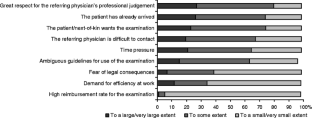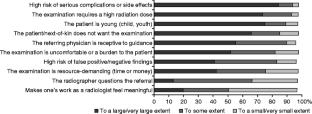 A survey was mailed to Norwegian radiologists; 69% responded. They graded the frequencies of actions related to referrals with ambiguous indications or inappropriate examination choices and the contribution of factors preventing and not preventing an examination of doubtful usefulness from being performed as requested.