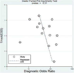 Deeks JJ, Macaskill P, Irwig L (2005) The performance of tests of publication bias and other sample size effects in systematic reviews of diagnostic test accuracy was assessed. J Clin Epidemiol 58:882–893