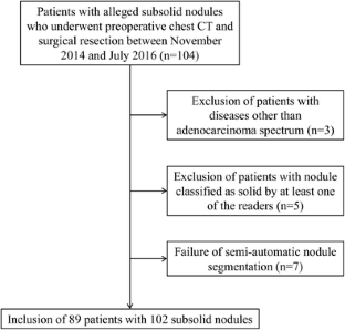 We hypothesized that semi-automatic diameter measurements would improve the accuracy and reproducibility in discriminating preinvasive lesions and minimally invasive adenocarcinomas from invasive pulmonary adenocarcinomas appearing as subsolid nodules (SSNs) and increase the reproducibility in classifying SSNs.