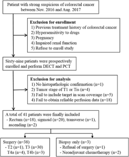 To determine the correlation between iodine concentrations derived from dual-energy CT (DECT) and perfusion CT (PCT) parameters in patients with pathologically proven colorectal cancers (CRC) and to evaluate their reproducibility and respective radiation exposures.