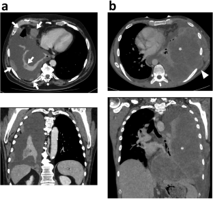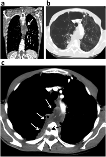 Of the 21 included patients (median age 48, range 30–74), 18 (85.7%) were male and 18 (85.7%) had a smoking history. Four main radiological patterns were identified depending on the location of the main tumor burden: mediastinal (n = 13), pleural (n = 6), cervical (n = 1), and retroperitoneal (n = 1). Median size was 120 mm (range 46–266). Characteristic CT imaging features of primary tumors included ill-defined margins (n = 21), heterogeneous enhancement after injection (n = 20), multi-compartment extension from mediastinum to lung apex, pleura, or neck (n = 20), compressive effect responsible for atelectasis (n = 11), vascular encasement (n = 16—5 superior vena cava syndrome), and esophagus invasion (n = 5). Primary tumors showed strong 18F-FDG avidity in eight patients with PET-CT. Necrotic lymphadenopathies were found in 19 patients, with a surrounding infiltrate in 13 patients. Metastatic locations at baseline mainly involved adrenal (n = 10), lung (n = 6), and bone (n = 5). Median overall survival was 5 months (range 1–13).