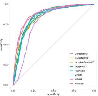 • Of the eight models, the Xception algorithm was the best performing model for the external validation dataset with 0.884 AUROC. The accuracy, sensitivity, specificity, positive predictive value, and negative predictive value were 82.8%, 80.2%, 83.0%, 83.0%, and 80.2%, respectively.