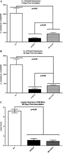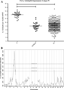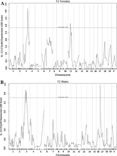 Inflammatory bowel diseases (IBDs) are complex disorders caused by a combination of environmental, microbial, and genetic factors. Genome-wide association studies in humans have successfully identified multiple genes and loci associated with disease susceptibility, but the mechanisms by which these loci interact with each other and/or with environmental factors (i.e., intestinal microbiota) to cause disease are poorly understood. Helicobacter hepaticus-induced intestinal inflammation in mice is an ideal model system for elucidating the genetic basis of IBD susceptibility in a bacterially induced system, as there are significant differences in H. hepaticus-induced disease susceptibility among inbred mouse strains. Infected A/J mice develop acute overexpression of proinflammatory cytokines followed 2–3 months later by chronic cecal inflammation, whereas infected C57BL/6 mice fail to develop cecal inflammation or increased cytokine expression. The goal of this project was to use quantitative trait locus (QTL) mapping to evaluate genetic factors that contribute to the differential disease susceptibility between these two mouse strains. Using acute cecal IL-12/23p40 expression as a biomarker for disease susceptibility, QTL analysis of H. hepaticus-infected F2 mice revealed involvement of multiple loci. The loci with the strongest association were located on Chromosome 3 and Chromosome 17, with logarithm of odds (LOD) scores of 6.89 and 3.09, respectively. Cecal expression of IL-12/23p40 in H. hepaticus-infected C57BL/6J-Chr3A/J/NaJ chromosome substitution mice had an intermediate phenotype, significantly higher than in resistant C57BL/6 but lower than in susceptible A/J mice, confirming the importance of this locus to the immune response to H. hepaticus infection.