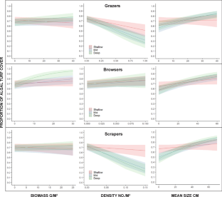 Herbivorous fish are key to maintaining a balance between coral and algae on reefs, where reefs with greater herbivore biomass often show lower algal cover. For reefs worldwide, algal turf cover is expanding and is increasingly used as an indicator of disturbance. Water depth affects reef fish composition; thus, it may be expected that herbivory could also differ by depth. We examined relationships between algal turf cover and biomass (g m−2), density (# m−2) and size (cm) of herbivore groups (grazers, browsers and scrapers) across shallow (< 6 m), mid (6–18 m) and deep (18–30 m) coral reefs in the Main Hawaiian Islands. We find that across all depth classes, algal turf cover decreased with increasing grazer and scraper density, with steeper relationships observed at mid and deep reefs than in shallow reefs. In contrast, algal turf cover slightly increased with increasing grazer and browser biomass at deep reefs. Considering fish size, algal turf cover increased with larger grazer and scrapers at mid and deep reefs. The results indicate that herbivorous fish density, rather than biomass, is a better indicator of reductions in algal turf cover and resulting coral-algal balance on Hawaiian reefs, where smaller fish exert greater top-down control on cover than larger fish. Despite significant differences in herbivorous fish compositions, length-frequency distributions and fishing intensities across depth, algal turf cover remains similar across depths. Increases in fishing would have a disproportionately negative impact in deep than shallow reefs due to a lower overall fish density, where grazing functions in deep reefs are maintained by significantly fewer and smaller grazers and browsers, and larger scrapers, than in shallow reefs. Developing an understanding of patterns of algal turf herbivory by depth is important to understanding the spatial scale at which herbivory and regime shifts operate.