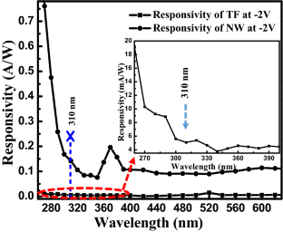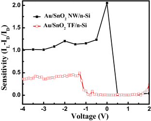 In this paper, we have demonstrated UV photodetector based on SnO2 nanowire (NW) arrays fabricated using a catalytic free and controlled growth process called glancing angle deposition technique. The fabricated SnO2 NWs were amorphous in nature with highly periodic and perpendicularly oriented structures of length ~ 160 ± 5 nm with ~ 60 ± 5 nm average diameter. The reported Au/SnO2 NW/n-Si device showed a good rectifying behavior with a rectification ratio of ~ 6 due to the formation of high-quality Schottky contact at the Au/SnO2 NW interface. The Au/SnO2 NW/n-Si device exhibited a high responsivity (0.142 A/W) and external quantum efficiency (56.8%) at − 2 V applied bias as compared to the Au/SnO2 thin-film (TF)/n-Si device. Moreover, the Au/SnO2 NW/n-Si device attained a high detectivity of 10.8 × 1010 Jones and noise equivalent power as low as 38.8 × 10−12 W. The high surface to volume ratio and the enormous amount of photogenerated carriers in case of SnO2 NW arrays made the Au/SnO2 NW/n-Si device to exhibit high photosensitivity. Furthermore, on UV illumination, the Au/SnO2 NW/n-Si detector showed fast device response with a rise time of 0.18 s and a fall time of 0.25 s. The current conduction mechanism in case of Au/SnO2 NW/n-Si device is explained with respect to device band diagram.