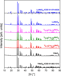 Herein, we demonstrate the photoluminescence properties of Dy3+-activated YNbO4, LuNbO4, and mixed YxLu1−xNbO4:Dy3+ (x = 0.25, 0.5, 0.75) phosphors. For this purpose, five samples with a fixed Dy3+ concentration (2 mol%) were prepared by the solid-state reaction method. X-ray diffraction measurements showed that all phosphors crystallize in a monoclinic fergusonite-beta-(Y) structure with a C2/c space group. Scanning electron microscopy clearly shows that samples are composed of dense, well-developed micron-sized, cube-shaped grains with rounded edges. The photoluminescent emission spectra feature Dy3+ peaks at standard positions corresponding to transitions from the 4F9/2 excited emitting level to the 6HJ (J = 15/2; 13/2; 11/2 and 9/2) lower levels with two dominant emission bands placed in the blue (~ 479 nm, B) and yellow (~ 576 nm, Y) spectral region. It is observed that with Lu increase in the host lattice Y/B ratio decreases toward the desired ratio of unity to obtain white light. To evaluate the suitability of these phosphors for use in solid-state lighting, their photoluminescence emission was analyzed in detail by calculating CIE coordinates, correlated color temperature (CCT) and Delta u,v (DUV). It is shown that CIE chromaticity coordinates of all Dy3+-activated YxLu1−xNbO4 samples (x = 0, 0.25, 0.5, 0.75, and 1) fall into the white portion of the diagram and that with the increase of Lu in the host lattice color becomes whiter. CCT values for all samples are in the cooler 4000–4500 K range with positive DUVs indicating that color points are placed above the black body curve. The average lifetime of 4F9/2 level is calculated to be ~ 0.2 ms for all Dy3+-activated YxLu1−xNbO4 samples, indicating that there is no influence of the Y-to-Lu ratio in the host niobate material on the luminescence kinetics.