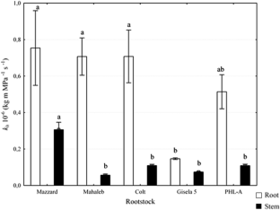An anatomical study of roots and stems of five self-rooted cherry rootstocks with different growth control potentials was performed to compare their structure and xylem anatomy. The aim was to correlate anatomical parameters with rootstock dwarfing potential and theoretical hydraulic conductance (k h), and to evaluate the potential application of anatomical characteristics in the preselection process for prediction of ultimate tree vigor. One of the mechanisms of water transport efficiency reduction in dwarfing rootstock stems is from the rootstock xylem anatomy. Anatomical parameters of ‘Gisela 5’ and ‘Mazzard’ were typical for dwarfing and vigorous rootstocks, respectively, and were thus suggested as reference rootstocks. Significantly greater vessel diameter and frequency were found in invigorating and dwarfing rootstocks, respectively. Higher k h was obtained in roots, compared to stems, due to significantly larger vascular elements. Dwarfing rootstocks had lower k h due to small vessel lumens and percentage and, to a lesser extent, because of low wood/cortex ratios or percentage of wood. A higher percentage of wood or xylem in cherry roots and stems was not always positively correlated with their conductivity and vigor. Thus, these parameters cannot be reliably used in prediction of the ultimate vigor, although this method was previously suggested for some other fruit tree species. The most reliable anatomical parameters for that purpose proved to be vessel frequency, vessel lumen area, and percentage of vessels on wood cross section. These characteristics could thus be an effective way to estimate dwarfing capacity and could be applied in rootstock selection and breeding programs.
