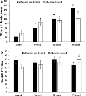 The study is focused on changes in metabolism of Matricaria chamomilla, caused by potassium nitrate (KNO3) supplement and foliar application of an ethylene releaser—ethephon (ET). ET-treated plants were irrigated with 0, 9, 18 or 27 mmol of KNO3 during 1 week and simultaneously treated with ET. The same procedure was followed with ET non-treated plants, where an equal amount of distilled water was sprayed on leaves. Nitrogen addition into soil substrate caused considerable increment in dry matter content, nitrate accumulation and amino acids synthesis. After ET application, a positive correlation between KNO3 supply and stress-related parameters, such as superoxide radical, hydrogen peroxide and malondialdehyde was found. Experimental conditions led to a sharp decrease in herniarin level, which was accompanied with increasing content of its glycosidic precursors in ET-treated plants. The observations indicated that higher doses of nitrate suppressed the stimulation effect of ET on the production of salicylic acid and umbelliferone, metabolites, which are involved in stress responses in plants. In the case of umbelliferone, ET strongly induced its accumulation in comparison with ET non-treated variants.