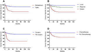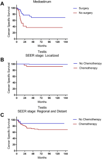 The major primary sites of YST were testis (74.69%), mediastinum (15.47%), retroperitoneum (2.64%) and central nervous system (1.24%). The 3-year and 5-year CSS was 70.0%, 56.5% vs. 97.2%, 96.0% for the mediastinal and testicular YST patients, respectively (p < 0.001). Primary site of mediastinum, distant SEER Summary stage were independent factors of poor prognosis (hazard ratio (HR) = 2.010 (1.094–3.695), p = 0.025; HR = 6.501 (2.294–18.424), p < 0.001, respectively). Receiving surgery was a good prognosis factor for all patients (HR = 0.495 (0.260–0.940), p = 0.032) and for the mediastinal group (p = 0.0019). Being treated with chemotherapy indicated poor outcome in all patients (HR = 3.624 (1.050–12.507), p = 0.042) and in the localized testicular YST patients (p = 0.0077).