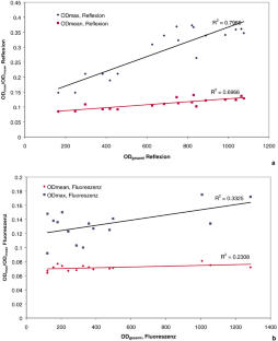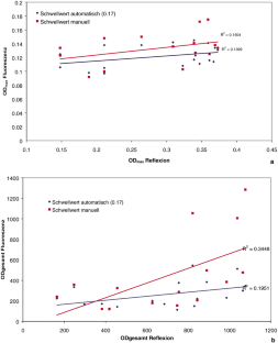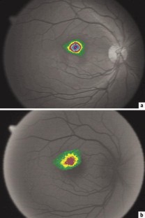 The local distribution of xanthophyll density was determined from monochromatic blue reflection images and autofluorescence images of the fundus in 18 healthy volunteers (mean age: 23.9 years). The significance of the parameters maximal, global, and mean concentration were compared.