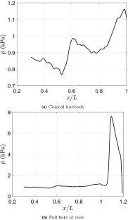 Global surface pressure measurements have been carried out on a 7° half-angle circular cone/flare model at nominally zero angle of attack using pressure-sensitive paint (PSP). These experiments were conducted to illustrate the PSP technique’s usefulness and effectiveness at measuring the unsteady structures inherent to hypersonic shock-wave/boundary-layer interactions (SWBLI) on a global scale. Mean and fluctuating surface pressure was measured with a temperature-corrected, high-frequency-response (\(\approx 10\) kHz) anodized-aluminum pressure-sensitive paint (AA-PSP). This AA-PSP was made in-house to provide the high frequency response required. Methodologies for tracking the boundary-layer separation and reattachment shock feet in both time-averaged and instantaneous senses are provided and discussed. Excellent agreement is observed between the different metrics. In addition, spectral analyses were conducted on a global scale providing insights into the unsteady dynamics of the shock feet and structures under the separated shear layer. These spectral analyses identified a smooth, low-frequency bandwidth centered at \(\approx 500\) Hz, which is characteristic of the shock-foot oscillations. These experimental findings validate the usefulness of AA-PSP to provide global physical insights of unsteady SWBLI surface behavior in the hypersonic flow regime. Similar methodologies can be incorporated in future experiments to investigate complex and novel SWBLI.