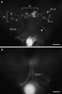 The morphology and functions of the brain neurons projecting to the retrocerebral complex were examined in terms of photoperiodic control of adult diapause in the bean bug, Riptortus pedestris. Backfills through the nervi corporis cardiaci stained 15–20 pairs of somata in the pars intercerebralis (PI) with contralateral axons, and 14–24 pairs in the pars lateralis (PL) with ipsilateral axons to the nervi corporis cardiaci. In the PL, two clusters of somata, PL-d and PL-v, were found. Forwardfills showed neurons in the PI terminated in the aorta, and those in the PL at the corpus cardiacum, corpus allatum, and aorta. Removal of the PI did not cause effects on diapause incidence both under short-day (12 h:12 h, light:dark) and long-day conditions (16 h:8 h, light:dark) at 25°C. Under short-day conditions, diapause incidence was significantly lower than the controls after removal of the PL. Either removal of PL-d or PL-v did not reduce diapause incidence. It decreased only when both the PL-d and PL-v were ablated. The PI is not indispensable for diapause in R. pedestris, and both PL-d and PL-v neurons are suggested to be involved in photoperiodic inhibition of ovarian development.