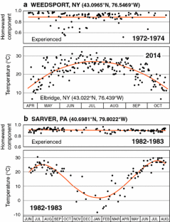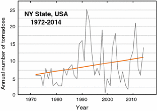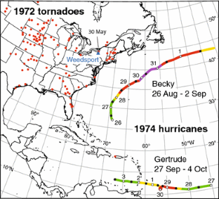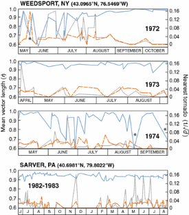 We wish to thank all those who, with W. T. Keeton, produced the large quantity of pigeon-release data at Cornell University between 1967 and 1980, and I. Brown, T. Larkin and S. T. Emlen for making them available to all investigators in 1984. C. Walcott kindly sent us the “Keeton” database, and we thank T. Larkin for providing his program to manipulate and display the data, as well as insider information concerning the Weedsport pigeon releases. D. Sills and W. Szilagyi of Environment Canada generously sent us Canadian tornado data and information on Great Lakes waterspouts, respectively. A. J. Bedard (National Oceanic and Atmospheric Administration/Cooperative Institute for Research in Environmental Sciences), B. Thigpen (Eminent Technologies), and D. B. Quine graciously shared their acoustical expertise during informative discussions. L. Anderson and C. Bacon of the US Geological Survey provided helpful comments on an early version of the manuscript, and constructive reviews from three anonymous reviewers are also much appreciated. Funding for this work came, in part, from a US Air Force Small Business Innovative Research Grant (FA9302-12-C-0006) facilitated by a Cooperative Research and Development Agreement between the US Geological Survey and Technology International Incorporated of Virginia.