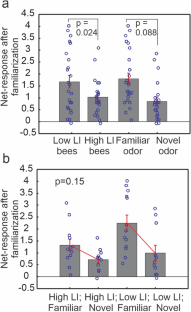 Associative learning enables animals to predict rewards or punishments by their associations with predictive stimuli, while non-associative learning occurs without reinforcement. The latter includes latent inhibition (LI), whereby animals learn to ignore an inconsequential ‘familiar’ stimulus. Individual honey bees display heritable differences in expression of LI. We examined the behavioral and neuronal responses between honey bee genetic lines exhibiting high and low LI. We observed, as in previous studies, that high LI lines learned a familiar odor more slowly than low LI bees. By measuring gustatory responses to sucrose, we determined that perception of sucrose reward was similar between both lines, thereby not contributing to the LI phenotype. We then used extracellular electrophysiology to determine differences in neural responses of the antennal lobe (AL) to familiar and novel odors between the lines. Low LI bees responded significantly more strongly to both familiar and novel odors than the high LI bees, but the lines showed equivalent differences in response to the novel and familiar odors. This work suggests that some effects of genotype are present in early olfactory processing, and those effects could complement how LI is manifested at later stages of processing in brains of bees in the different lines.