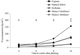 Improved fallows with leguminous trees have been developed in Southern Africa as a viable alternative to inorganic fertilizers but the changes in soil properties that are responsible for crop productivity improvement and implications of mixing litter and fresh leaves from the same tree species on soil fertility are not fully understood. Our objectives were to quantify (1) some changes in soil properties that are responsible for crop production improvement under improved fallow systems; (2) the N mineralization patterns of mixtures of litter and fresh leaves from the same tree species. The treatments used in the study were 2-year planted Sesbania sesban (sesbania) and Cajanus cajan (cajanus) and controls of natural fallow, continuous fertilized and unfertilized maize. At fallow clearing sesbania contributed 56 kg N ha−1 through litter and fresh leaves. Sesbania (fresh leaves + litter) showed high N mineralization after 10 weeks compared to the mixture of cajanus fresh leaves with litter. Maize yields were significantly correlated with preseason NO3 −-N and total inorganic-N content of the top 20-cm soil layer. Soil penetrometer resistance at 4 weeks after planting was lowest in the sesbania land-use system (2.2 Mpa), whereas the highest percentage of water-stable aggregates at fallow clearing and crop harvest was in sesbania (83%) and cajanus (77%), respectively. The improved soil conditions and N contribution of sesbania and cajanus fallows to the subsequent maize crop was evidenced by increased maize yields of between 170–200% over maize without fertilizer.