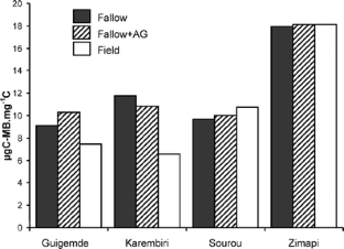In the soudano–sahelian zone of Burkina Faso, the short-term fallow effect on the soil chemical and microbial properties was evaluated. In four farm experiments, two types of fallows were compared with cultivated fields: a natural vegetation fallow and a fallow enriched with Andropogon gayanus. After 5 to 7 years of experiments, soil chemical and microbial characteristics were determined in laboratory for 0–10 cm soil depth. Soil organic carbon (+64%), nitrogen (+35%), microbial biomass (+76%), basal respiration (+141%), and β-glucosidase activity (+86%) were significantly higher in fallows plots than in cultivated fields. The metabolic quotient was not significantly different on fallows compared to the cropped plots. Also, no significant difference was highlighted between natural vegetation fallows and the A. gayanus-enriched one.