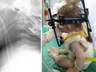 A toddler suffered a CSI without neurological deficits after a stair fall. Computer tomography (CT) and magnetic resonance imaging (MRI) of the cervical spine revealed an instable luxation fracture of C2/3. As repositioning in the halo vest immobilization failed, surgical fusion was indicated.