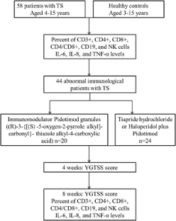 Blood samples from 58 patients with TS and 128 age-matched healthy controls enabled measurement of antistreptolysin O (ASO), T cells, natural killer (NK) cells, interleukin-6 (IL-6) and interleukin-8 (IL-8), and tumor necrosis factor-α (TNF-α). Forty-four patients with abnormal T cell numbers were divided into two groups and treated with pidotimod granules (pidotimod group, n = 20) or pidotimod plus dopaminergic receptor antagonists (combination group, n = 24). Yale Global Tic Severity Scale (YGTSS) scores and immunologic indices were assessed after treatment.