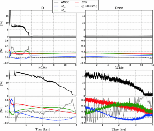 where S is salinity, u is the horizontal velocity vector and \(\mathcal{F}_S\) is the diffusive salt flux. Diffusive fluxes depend on model definition, so we do not write them explicitly here. Integrating Eq. 5 over the whole Atlantic basin, using Gauss theorem and assuming no salt flux at the surface and bottom and no diffusion across Bering strait, one obtains: