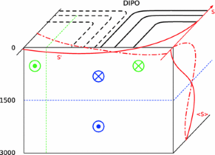 with V t = ∂V/∂t the volume drift in the basin, and defining \(M_{BS}= \int_{BS}v \hbox{d} x \hbox{d} z-\frac{1}{S_0} \int_{BS}vS \hbox{d} x \hbox{d} z\). The inflow of freshwater in the basin must balance net evaporation and the drift in volume and salinity.