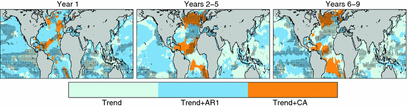 Over parts of the tropical Atlantic, CA appears to have some predictive skill for the internal variability as well. The correlation coefficient for the internal variability exceeds 0.4 for year 1 and years 2–5. The MSSS of Trend+CA relative to both Trend and Trend+AR1 also shows that the CA is more skillful for these two periods and perhaps even for years 6–9. However, comparing the time series of observations and year 8 forecasts for the grid box centred at 17.5°N 57.5°W in Fig. 5d, Trend+CA does not seem to have a clear advantage over Trend+AR1.