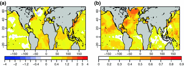 Another feature worth exploring is the importance of longer timescale variability relative to interannual variability. This is because the former is related to slow ocean processes and is considered to be, at least potentially, more predictable. We consider a simple measure of the potential predictability (Boer 2004, 2011; Boer and Lambert 2008) of X v for a timescale of N years, σ N /σ, where σ N is the standard deviation of the running N-year mean of estimated X v . Figure 2e, f show this measure for N = 5 and 10 years. Larger potential predictability can be found over the most of the North Atlantic. Previous observational and modelling studies have suggested that this is related to decadal variations in the North Atlantic thermohaline circulation and the North Atlantic Oscillation (e.g. Latif et al. 2006). The potential predictability is smaller over the tropical Pacific where ENSO-related interannual variability dominates.