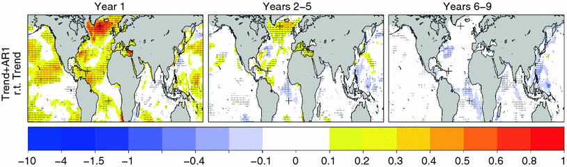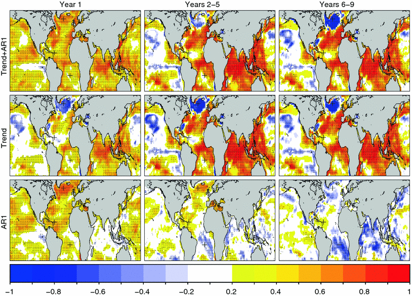 The predictive skill for the far North Atlantic is more interesting. The ACC for Trend+AR1 drops from around +0.7 to around −0.8 as we move from year 1 to years 6–9. The correlation for Trend is negative for all three periods, however the correlation for AR1 is greater than 0.5 for year 1 and years 2–5. The MSSS is also significantly greater than zero (at 10 % level; same for below unless otherwise stated) for these two periods. These suggest that the AR1 model gives skillful predictions of the internal variability over the far North Atlantic for shorter lead times, but the poor forced trend prediction offsets such skill. These results are similar to the global decadal air temperature retrospective forecasts by Krueger and von Storch (2011), where the ACC is larger than 0.7 for year 1 but is not significantly greater than zero (at 5 % level) for year 10.
