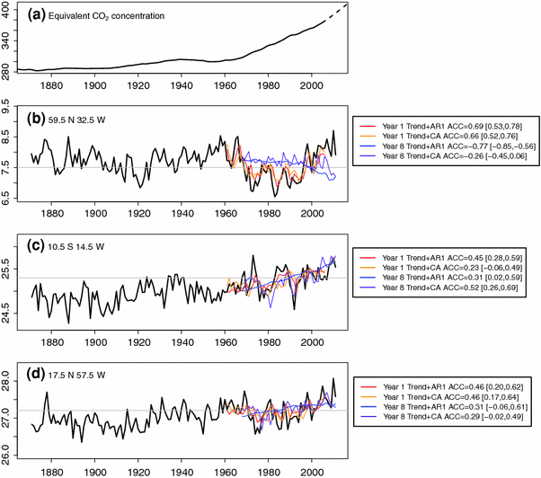 a Time series of global mean equivalent CO2 concentration (in ppm) from 1870 to 2011, with the portion with dashed line indicating projections based on RCP 4.5; b–d Time series of observed SSTs (in °C) for three grid boxes (thick black solid lines) in the Atlantic. The thin grey horizontal line indicates the 1986–2005 mean. Retrospective forecasts by Trend+AR1 and Trend+CA for lead times of 1 and 8 years are overlaid with thin lines of different colours as indicated in the legend. The ACC for such forecasts and the corresponding 90 % bootstrap confidence interval (in parentheses) are also given in the legend