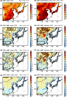 In this study, five regional climate models (RCMs) participating in the CORDEX-East Asia project (HadGEM3-RA, RegCM4, SNU-MM5, SNU-WRF, and YSU-RSM) are evaluated in terms of their performances in simulating the climatology of summer extremes in East Asia. Seasonal maxima of daily mean temperature and precipitation are analyzed using the generalized extreme value method. RCMs show systematic bias patterns in both seasonal means and extremes. A cold bias is located along the coast, whereas a warm bias occurs in northern China. Overall, wet bias occurs in East Asia, but with a substantial dry bias centered in South Korea. This dry bias appears to be related to the colder ocean surface around South Korea, positioning the monsoonal front further south compared to observations. Taylor diagram analyses reveal that the models simulate temperature means more accurately compared to extremes because of the higher spatial correlation, whereas precipitation extremes are simulated better than their means because of the higher spatial variability. The latter implies that extreme rainfall events can be captured more accurately by RCMs compared to the driving GCM despite poorer simulation of mean rainfall. Inter-RCM analysis indicates a close relationship between the means and extremes in terms of model skills, but it does not show a clear relationship between temperature and precipitation. Sub-regional analysis largely supports the mean–extreme skill relationship. Analyses of frequency and intensity distributions of daily data for three selected sub-regions suggest that overall shifts of temperature distribution and biases in moderate–heavy precipitations contribute importantly to the seasonal mean biases.