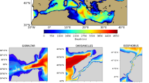 Concerning models’ capability to represent spatial trends, we found that, except in MORCE-MED, local negative trend anomaly patterns of the western basin are in correct agreement with those displayed by the satellite-derived data despite the models’ difficulties to represent an adequate circulation in the Alboran region (see Sect. 4.2.3). For the eastern basin, the negative trend anomaly pattern of the north-west Ionian, attributed to the post-EMT recovery, is present in all models, although it is shifted southward in MORCE-MED. Concerning the absence of trend anomaly patterns in North Aegean in all models, the representation of the Bosphorus is too crude to be able to show the impact of changes in the Black Sea outflow on the circulation.