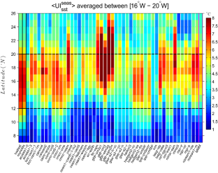 Over the SMUS region, the maximum wind speed is around 7 m s−1. We compared the meridional component of the wind stress computed online in the IPSL-CM5A-LR climate model to the wind stress computed offline using the meridional wind speed component from the same simulations with the drag coefficient values from Santos et al. (2012) and the two methods [Eqs. (9), (10)] drag coefficient listed above (figure not shown). We have chosen to test only the meridional wind component because it is the strongest one in the SMUS region and most directly associated to the upwelling intensity. We found that the scaling proposed in Gill (1982) underestimate the meridional wind stress amplitude north of roughly 15°N, in particular in summer north of 20°N, as well as in winter between 12°N and 20°N which the season and the latitude band of the SMUS. The Cd = 0.0014 scaling as used by Santos et al. (2012) yields the closest values to the observations. In all simulations where only the wind speed components are provided, the wind stress was thus computed using this latter scaling.