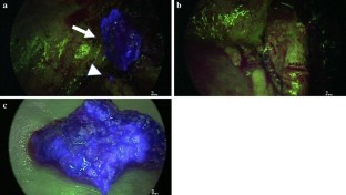 Navigation surgery using ICG was performed for primary liver tumors in 4 cases, and the timing of ICG injection was 90.5 ± 33.7 h before the operation. All tumors exhibited intense fluorescence from the liver surface. ICG navigation for the primary liver tumor was useful for detecting the residual tumor at the stump and invasion to the diaphragm during surgery. Six lung surgeries using ICG navigation were performed. The timing of ICG injection was 21.8 ± 3.4 h before the operation. The size of the metastatic tumor was 7.4 ± 4.1 mm (1.2–15 mm). Of 11 metastatic tumors detected by computed tomography (CT), 10—including the smallest tumor (1.2 mm)—were able to be detected by ICG from the lung surface. The depth of the 10 ICG-positive tumors from the lung surface was 0.9 ± 1.9 mm (0–6 mm), and the depth of the single ICG-negative tumor was 12 mm. One lesion not detected by CT showed ICG false positivity.