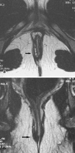 A retrospective review of ten children with the high/intermediate types of imperforate anus underwent LAR between May 2000 and December 2002. MRI of the pelvis was performed post-operatively and a semi-quantitative score was used to assess the degree of sphincter symmetry, peri-rectal fibrosis, and the position of the pull-through rectum. The defecation status of these patients was also recorded. Eight historical patients who had undergone PSARP served as a control group.