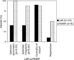 When compared with PSARP patients, a significantly lower proportion of LAR patients had sphincter asymmetry (40 vs. 100%, p<0.05) and peri-rectal fibrosis (40 vs. 87.5%, p<0.05). The positioning of the rectum was, however, central for both groups (90 vs. 87.5%). No statistical correlation was found between defecation status and the degree of sphincter asymmetry or peri-rectal fibrosis.