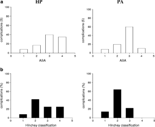 47 patients (64%) underwent sigmoid colectomy and PA, which was combined with loop ileostomy in 11 patients (15%). Sigmoid colectomy and HP was performed in 26 patients (36%). Major postoperative complications occurred in 26 patients (36%). In the PA group, 10 of 47 patients (21%) had anastomotic leakage. Three leakages occurred despite a loop ileostomy. Anastomotic leakage was independent of Hinchey category (Hinchey I: three patients, Hinchey II: four patients, Hinchey III: three patients, n.s.), but associated with co-morbidity (one patient ASA II, six patients ASA III, three patients ASA IV, P < 0.05). Total mortality was 12%. Seven patients died after HP and two patients after PA. No mortality was observed in PA patients with loop ileostomy.