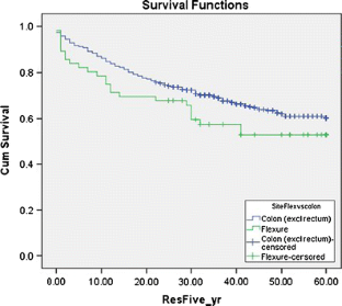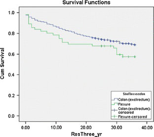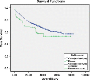 Patients with a diagnosis of colonic cancer over a 5-year period (2002–2006) were retrieved from a prospective database. Analysis was performed on flexure (hepatic/splenic) cancers versus remaining colon cancers. Overall, 1-, 3- and 5-year survival rates were calculated. All patients were followed up until death or end of study period (December 2008), with median follow-up of 32 months. Statistical analysis was performed using Kaplan–Meier with log rank statistic and Pearson chi-square test.