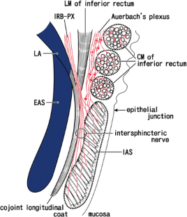 Fecal incontinence is a common problem after anal sphincter-preserving operations. The intersphincteric autonomic nerves supplying the internal anal sphincter (IAS) are formed by the union of: (1) nerve fibers from Auerbach’s nerve plexus of the most distal part of the rectum and (2) the inferior rectal branches of the pelvic plexus (IRB-PX) running along the conjoint longitudinal muscle coat. The aim of the present study is to identify the detailed morphology of nerves to the IAS.